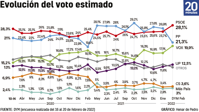 La brusca pèrdua de suports del PP a causa del seu cisma intern també provoca que el PSOE es col·loqui com a primera força política amb el 28,1% dels vots, un resultat gairebé dos punts i mig per sobre del que estimava el sondeig de gener. Els socialistes tornarien a aquesta posició gairebé un any després de perdre-la: la victòria d’Isabel Díaz Ayuso en les eleccions autonòmiques madrilenyes va catapultar el PP de Pablo Casado a una primera posició que ha mantingut en els sondejos des d’aleshores.