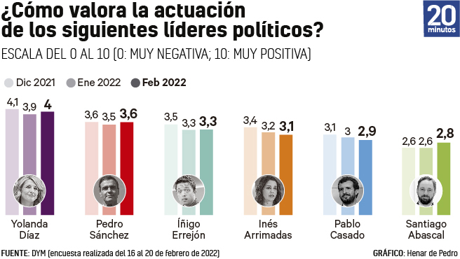 En l’extrem oposat, la líder política més ben valorada segueix sent la número u d’Unides Podem, la vicepresidenta Yolanda Díaz, que remunta després de la seva baixada del mes passat i obté un 4 de nota mitjana. Per la seva banda, el president i secretari general del PSOE, Pedro Sánchez, es manté en segona posició amb un 3,6.