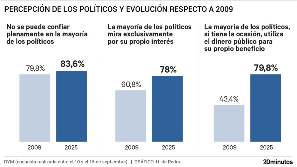 El hartazgo de la población con el escenario político actual, no obstante, va más allá de la desconfianza que les genera cómo se utiliza el dinero público. En general, más de cuatro de cada cinco encuestados (en concreto el 83,6%) creen que «no se puede confiar plenamente en los políticos», y nada menos que un 78% opinan que quienes se dedican a la cosa pública «miran exclusivamente por su propio interés». Es especialmente relevante cómo han crecido los recelos de la ciudadanía al ser preguntada por esta última cuestión, puesto que en el año 2009 quien opinaba que los políticos no tienen en cuenta el interés general era tan solo el 60,8% de la población.