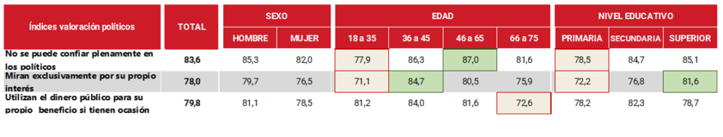 Con semejantes cifras negativas, el desencanto ciudadano con los políticos es generalizado en todas las franjas de edad, en ambos sexos, en las personas de todos los niveles educativos y entre los votantes de todos los partidos. Ninguno de los cruces revela un grupo social que se encuentre mayoritariamente satisfecho con los servidores públicos, aunque sí que pueden encontrarse en el barómetro algunas diferencias, especialmente al discriminar las respuestas en función de los años que tiene el encuestado.
