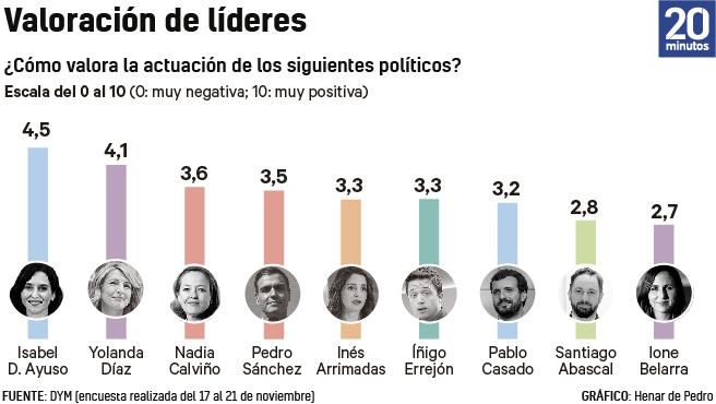 Por otra parte, el líder de Vox, Santiago Abascal, logra un 2,8 y es el líder nacional peor valorado; mientras que Iñigo Errejón (líder de Más País) e Inés Arrimadas (presidenta de Ciudadanos) empatan con un 3,3.