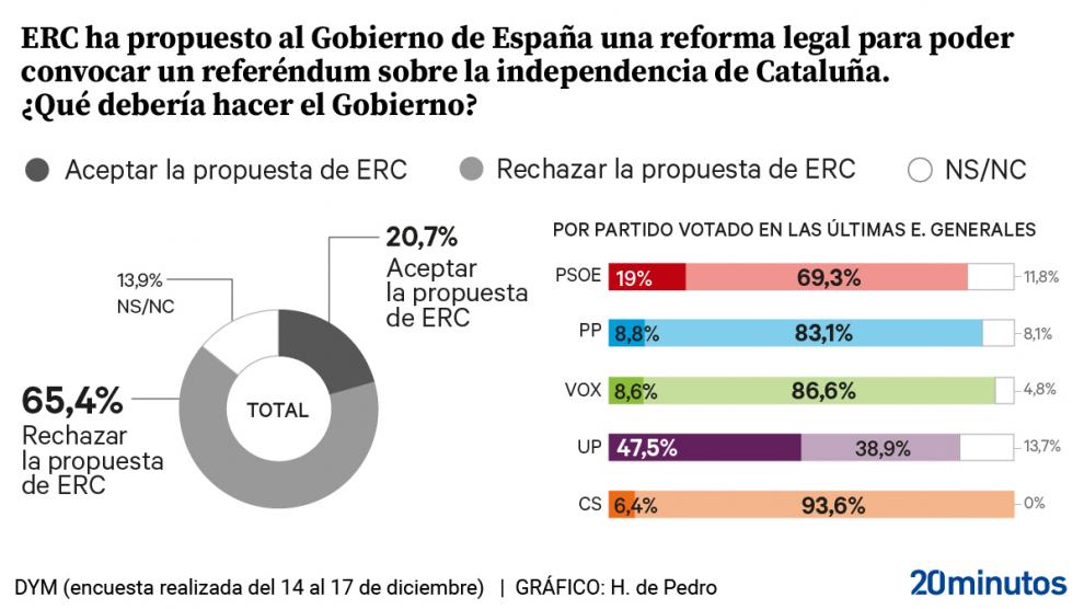 Así lo refleja el barómetro del mes de diciembre elaborado por DYM para 20minutos, que revela que una amplia mayoría de los encuestados están en contra de que el Gobierno acepte la propuesta de ERC de poner en marcha una reforma legal para convocar un referéndum de independencia. En concreto, un 65,4% de los ciudadanos asegura que el Ejecutivo debería rechazar esta iniciativa, y tan solo el 20,7% considera que sería lo apropiado aceptarla. Los que dudan o prefieren no contestar ascienden al 13,9%.