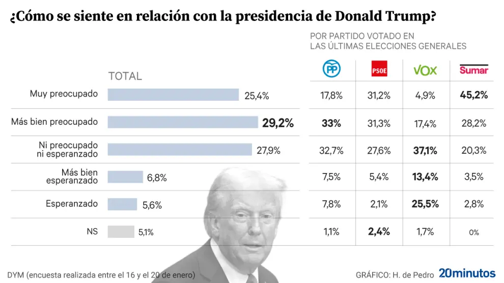 Dentro de las tendencias políticas que ven con más preocupación la llegada de Trump están los seguidores de Sumar, con un 45,2%, y los votantes del PSOE, con un 31,2%. En el otro extremo se sitúan los electores del Partido Popular, con un 17,8%, y a gran distancia los de Vox, ya que solo un 4,9% de estos votantes se siente muy preocupado. En este sentido, la formación de Santiago Abascal se ha mostrado en todo momento a favor de las tesis de Trump, que van desde la lucha contra la inmigración hasta el proteccionismo económico. En un hecho insólito dentro de las ceremonias de toma de posesión en Estados Unidos, Trump invitó a varios líderes y políticos con afinidad ideológica al acto, destacando el presidente argentino, Javier Milei, la primera ministra italiana, Giorgia Meloni, o el mismo Abascal, aunque este último como parte de una delegación del grupo al que pertenece Vox en el Europarlamento.