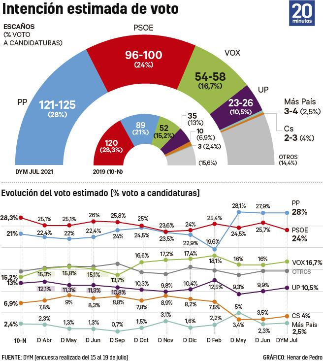 El PSOE pierde 1,8 puntos respecto a la medición de junio, arrastrado por una caída en la fidelidad de voto así como en la valoración de Pedro Sánchez, que pasa del 3,5 al 3,2, estando peor valorado que Pablo Casado. Una pequeña parte de la perdida de PSOE la recupera UP en intención de voto. Se mantiene la primera posición en estimación de voto de voto del PP, con una fidelidad similar a la de junio pero más baja que la obtenida en mayo. Situación similar presenta la valoración de Casado, similar respecto a los datos obtenidos en junio pero inferior que en mayo. Vox incrementa sus apoyos con respecto a la ola previa y C´s continua con una posición muy débil aunque presenta una ligera recuperación.