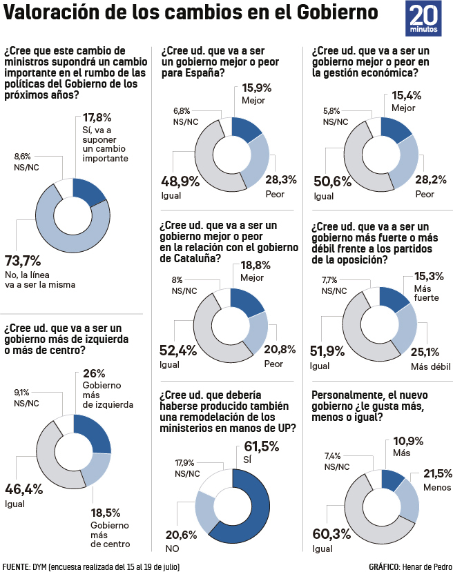 La valoración del gobierno y de Sánchez sigue dentro de los valores mínimos. Los cambios en el gobierno no han tenido un impacto significativo. A nivel personal, solo a el 10,9% de los españoles le gusta más el nuevo gobierno frente al 21,5% que le gusta menos, destacando un 60,3% ni le gusta más ni le gusta menos.