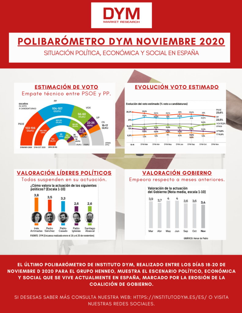 Desde Instituto DYM queremos recoger algunas de las principales conclusiones obtenidas sobre los situación política, económica y social en España, pertenecientes a nuestro último polibarómetro de noviembre realizado para HENNEO.