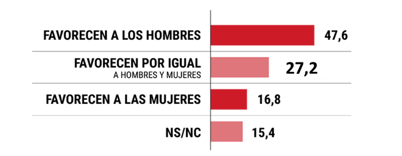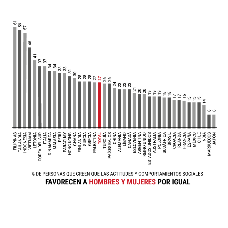 La encuesta WIN World Survey muestra que sólo el 27% de las personas en todo el mundo creen que las actitudes y comportamientos sociales tratan a hombres y mujeres por igual. Mientras que el 48% cree que los hombres son favorecidos, sólo el 17% cree que las mujeres son favorecidas.
